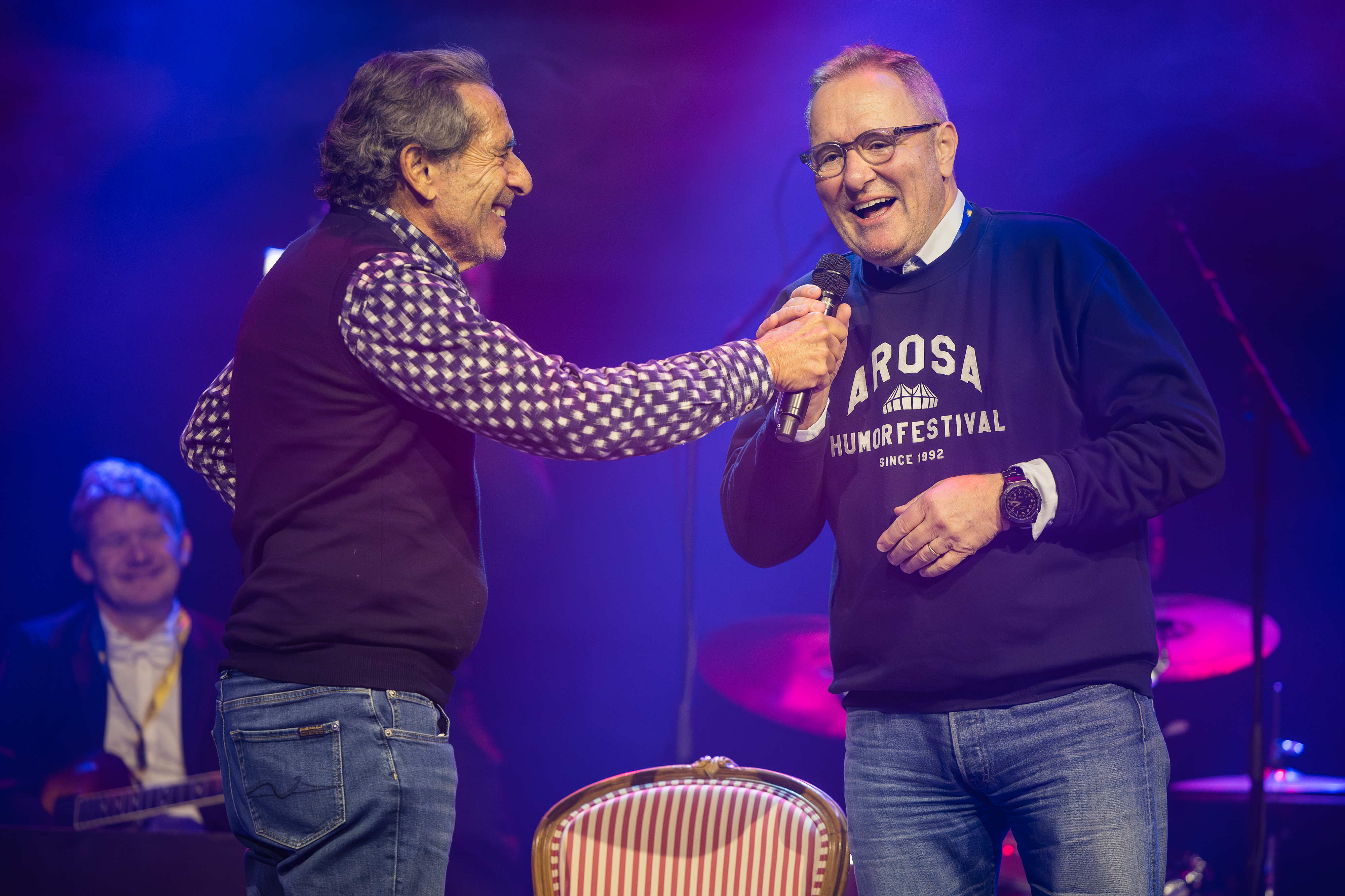 „Wow, was ist denn hier los, ich bin sprachlos», meinte der sichtlich gerührte Frank Baumann am Samstagnachmittag im Zirkuszelt auf 2‘000 Metern Höhe mitten im Skigebiet bei der Vorstellung, die so nicht auf dem Spielplan des 32. Arosa Humorfestivals stand. Eine extra für Frank Baumann erschaffene Show, samt einmaliger Dramaturgie wurde mit grösster Akribie und beispiellosem Fleiss von den Organisatoren des Arosa Humorfestivals entworfen. Nichts sickerte durch und so feierten mehr als 300 Zuschauende eine fulminante Überraschungsshow mit einem farbenfrohen Abschlussfeuerwerk der Humorkunst.